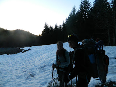 I arrived at the trailhead at about 5:15am. Beth and Kat were already packing up their tent. We agreed that we probably would not need crampons since it was 44 degrees at the trailhead, but we brought them anyway just in case. We also decided that we would need snowshoes based on my climb last year in similar conditions and on Earmuff Snake's observations from her climb earlier in the week. And, of course we had our ice axe and all the gear we would need for a successful climb.